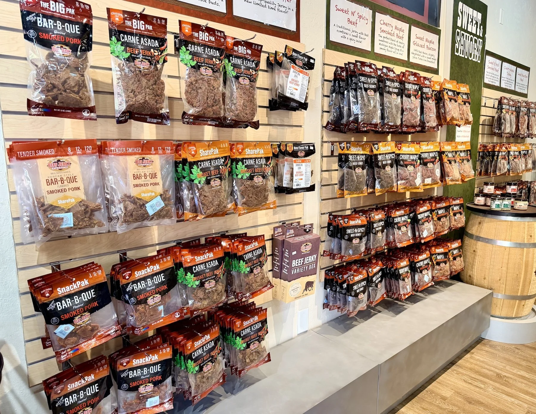 Founded on the principles of offering high-quality, small-batch jerky with a wide variety of flavors and exotic options, Beef Jerky Experience emphasizes an in-store tasting adventure. Customers are encouraged to "Try Before You Buy" from a selection of over 100 flavors, creating a "Jerky Heaven" atmosphere. Their vast selection ranges from traditional beef to exotic meats including alligator, kangaroo, and even insect-based treats.